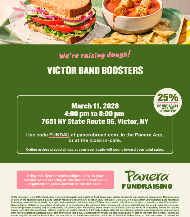 Wednesday, March 11 | 4–8 PM | Victor Location Skip the cooking and enjoy dinner at Panera while supporting a great cause! 25% of event …